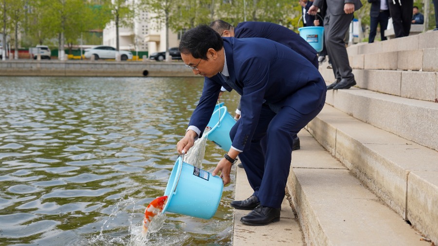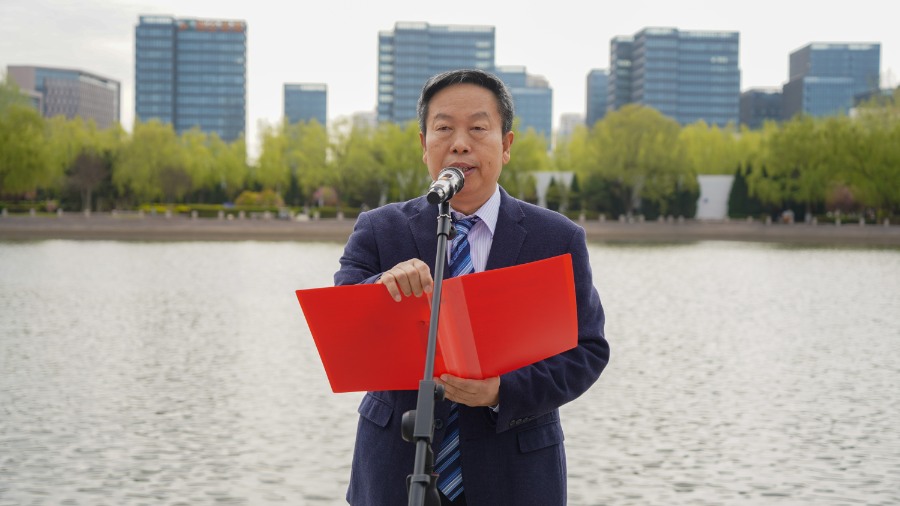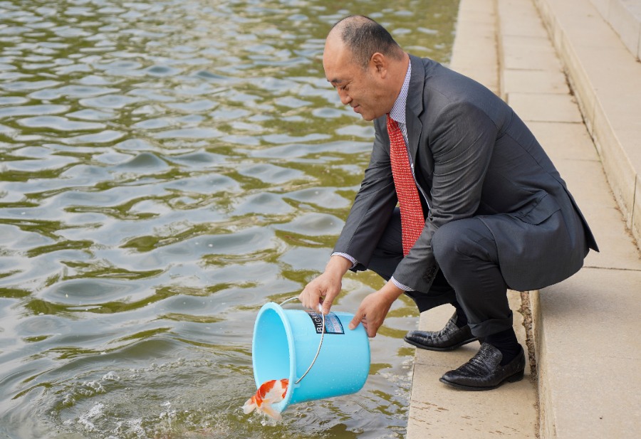 辛軍董事長、徐榮哲副總裁、于光輝校長、盛國軍書記等校領導及學生代表分別放養了錦鯉,為即將到來的校慶盛典添彩助力。
