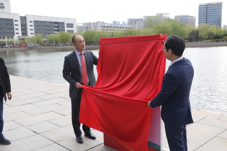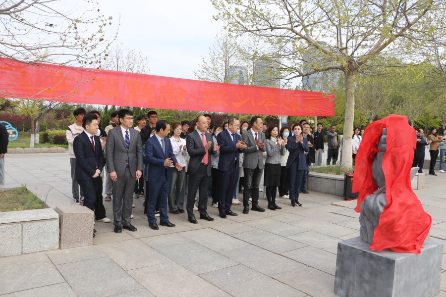 徐榮哲副總裁、捐贈者劉建坤共同為“錦鯉躍龍門”石雕揭彩。