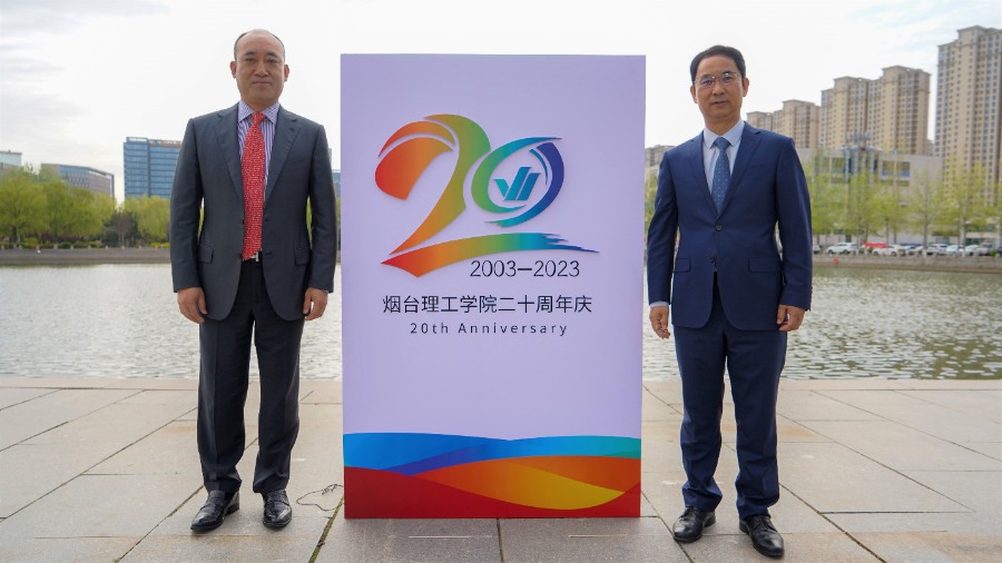 煙臺理工學院黨委書記盛國軍主持并介紹本次活動內容,辛軍董事長、于光輝校長共同為校慶20周年LOGO揭彩。