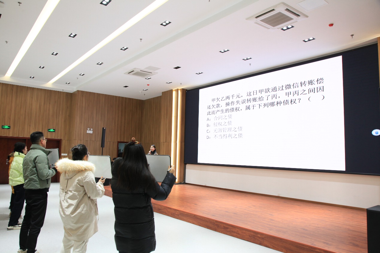 決賽采用線(xiàn)下積分制,由集團(tuán)聯(lián)隊(duì)、地產(chǎn)集團(tuán)、商管公司、礦業(yè)集團(tuán)、科技集團(tuán)、健康集團(tuán)六支代表隊(duì)參賽。決賽第一輪分必答題、搶答題、差異化賦分題三個(gè)環(huán)節(jié),題目涵蓋了憲法、民法等多方面法律知識(shí),充分考察各代表隊(duì)的法律知識(shí)水平和臨場(chǎng)應(yīng)變能力。最終得分前兩名礦業(yè)集團(tuán)代表隊(duì)和科技集團(tuán)代表隊(duì)進(jìn)入第二輪決賽。