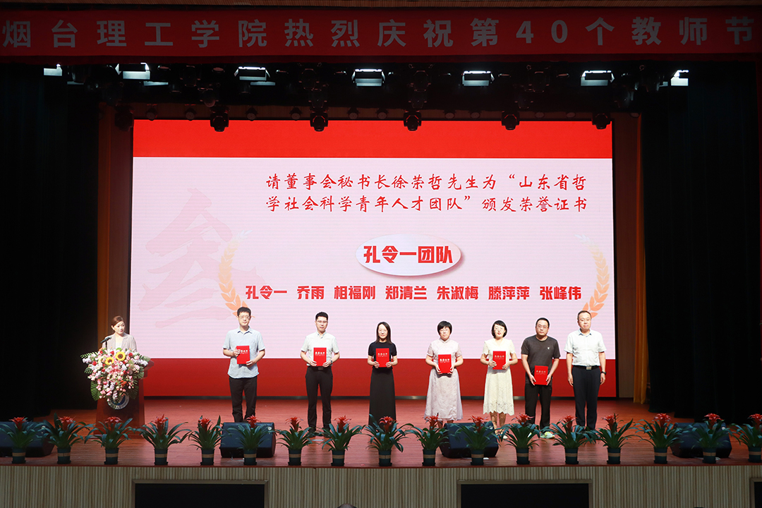 于光輝校長為校級教學(xué)競賽獲獎教師代表頒發(fā)榮譽(yù)證書;董事會秘書長徐榮哲先生給“山東省哲學(xué)社會科學(xué)青年人才團(tuán)隊”頒發(fā)榮譽(yù)證書;黨委書記盛國軍教授為“山東高校優(yōu)秀輔導(dǎo)員”頒發(fā)榮譽(yù)證書。